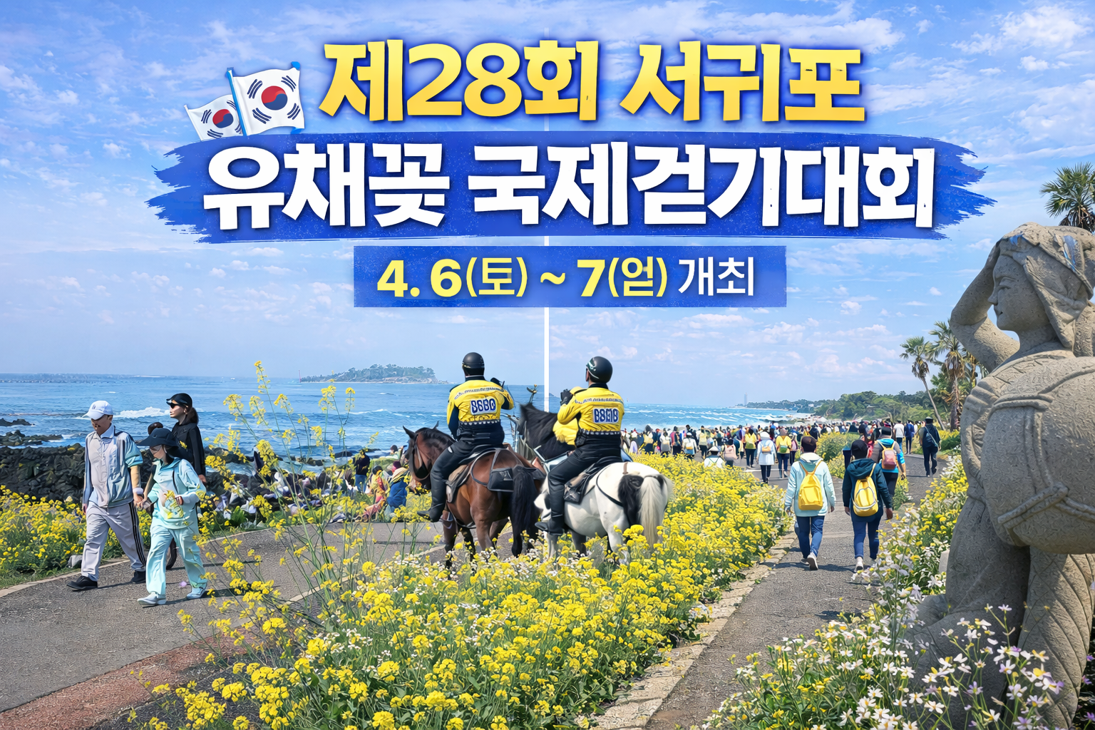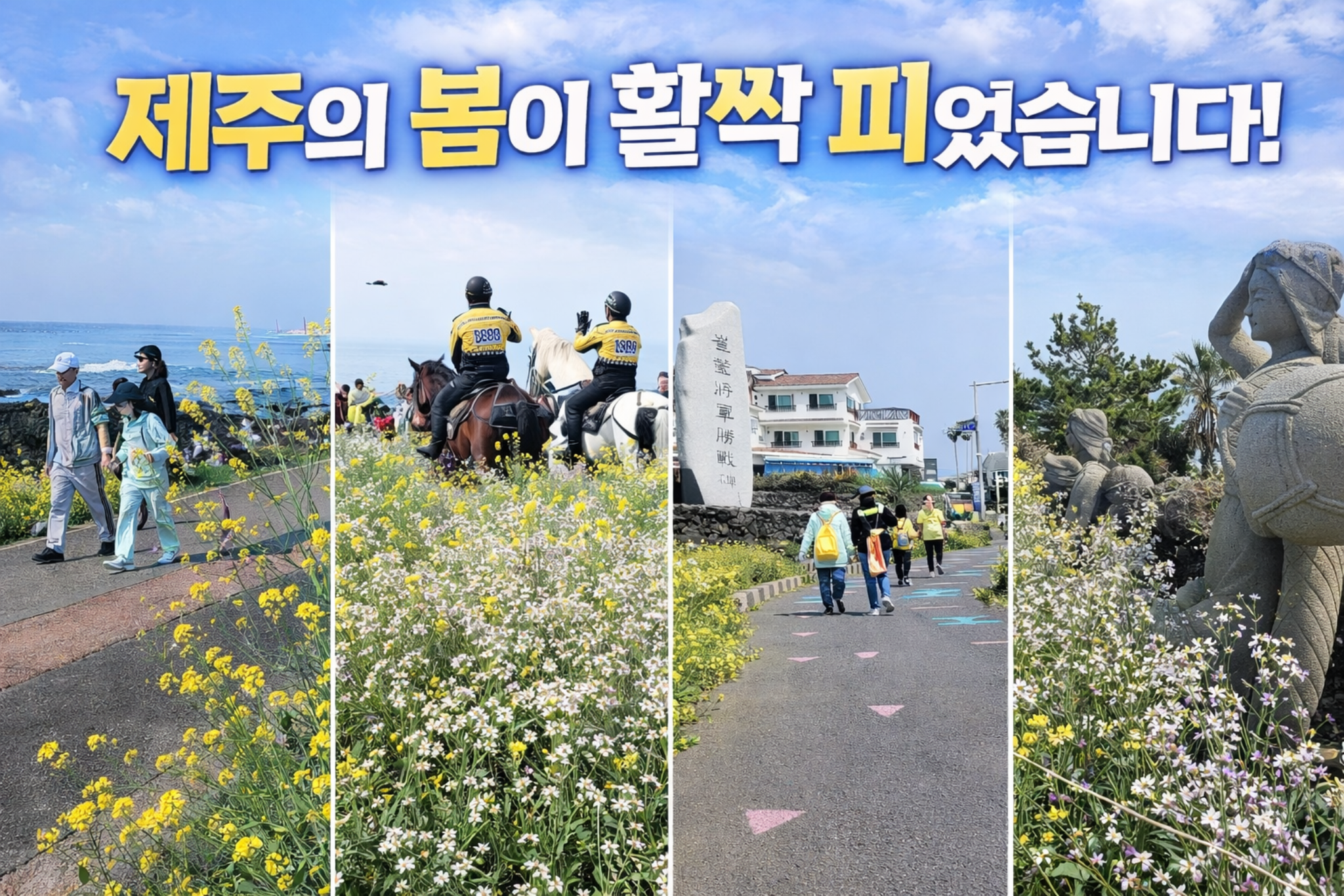 제주에 봄이 오면 가장 먼저 달라지는 것은 공기의 색감입니다. 겨울 내내 차분하던 풍경 위로 노란 유채꽃이 번지기 시작하면, 섬 전체가 마치 한 폭의 그림처럼 바뀝니다. 이번에 공개된 현장 사진들 역시 그런 제주의 봄을 그대로 보여줍니다. 바닷길을 따라 걷는 사람들, 유채꽃과 하얀 들꽃 사이를 지나는 말 탄 경찰, 조용한 마을길을 채우는 여행객들, 그리고 제주만의 상징 같은 돌조각과 꽃길 풍경까지 더해지면서 지금 제주가 얼마나 아름다운 계절을 맞이하고 있는지 실감하게 합니다.