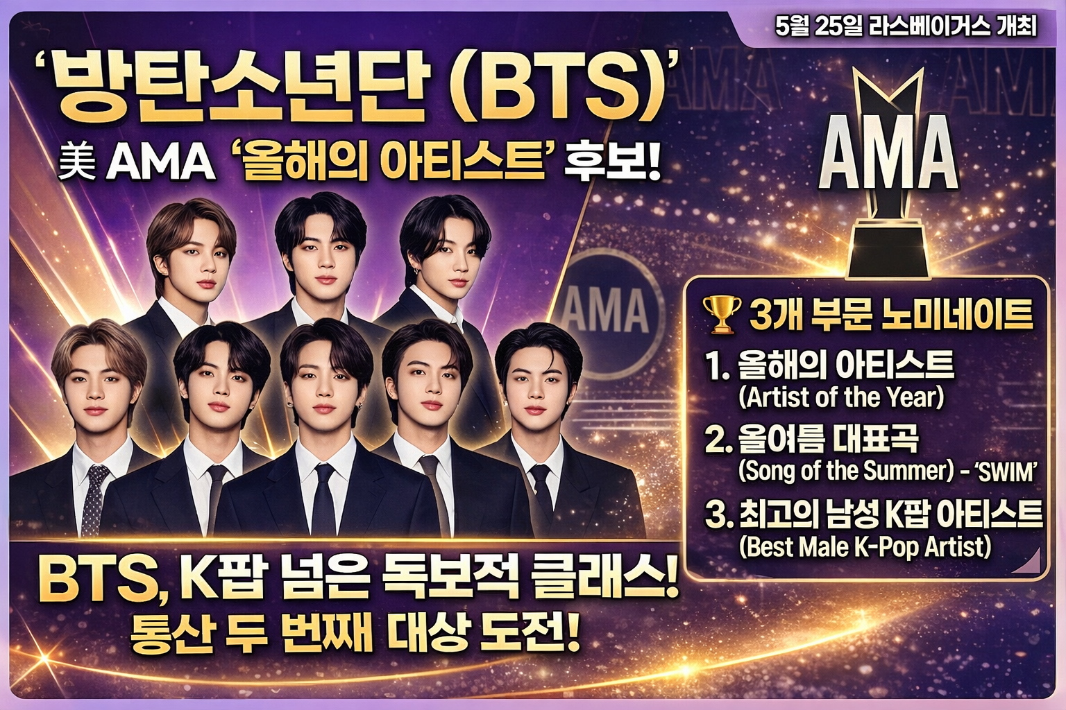 방탄소년단(BTS)이 미국 3대 대중음악 시상식 중 하나로 꼽히는 아메리칸 뮤직 어워즈(AMA)에서 올해의 아티스트를 포함한 3개 부문 후보에 올랐습니다. 단순한 후보 지명을 넘어, 군백기 이후 다시 글로벌 정상급 영향력을 확인했다는 점에서 의미가 큽니다.