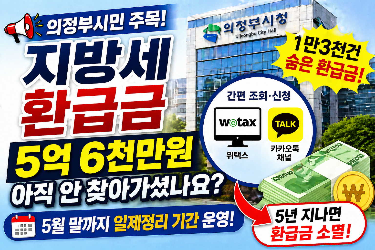 의정부시는 5월 말까지 지방세 환급금 일제정리 기간을 운영하며, 위택스와 카카오톡을 통해 누구나 간편하게 조회 및 신청할 수 있습니다.