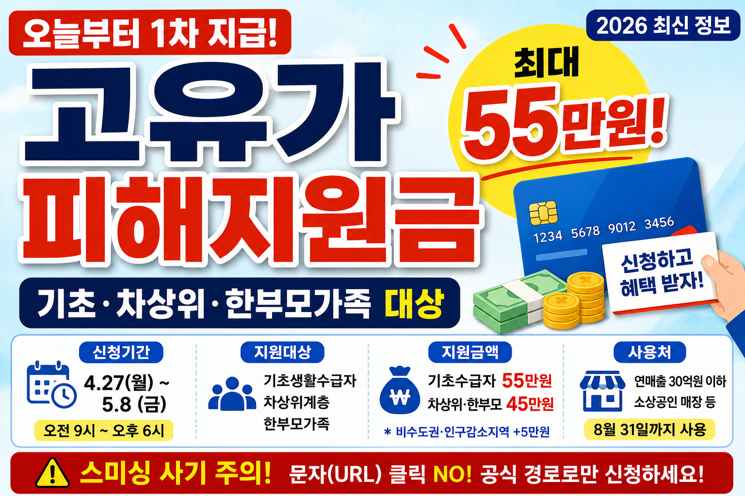 2026년 4월 27일부터 정부와 지자체는 고유가·고물가 상황으로 인한 국민 생활 부담을 줄이기 위해 ‘고유가 피해지원금’ 지급을 시작했습니다. 이번 1차 지급은 기초생활수급자, 차상위계층, 한부모가족 등 취약계층을 대상으로 진행되며 약 2주간 신청을 받습니다. 이번 정책은 단순한 현금 지급이 아니라 소비를 지역 내에서 유도하여 소상공인 매출을 증가시키고 지역 경제를 활성화하기 위한 목적도 함께 가지고 있습니다. 특히 최근 물가 상승으로 인해 체감 경제 부담이 커진 상황에서 실질적인 생활비 지원 효과를 기대할 수 있습니다. 신청 기간은 4월 27일 오전 9시부터 5월 8일 오후 6시까지이며, 이 기간 동안 온라인과 오프라인 모두 신청이 가능합니다. 다만 초기 혼잡을 방지하기 위해 출생연도 끝자리를 기준으로 요일제가 적용됩니다. 지원금은 신용카드, 체크카드, 선불카드, 지역사랑상품권 중 선택하여 지급받을 수 있으며, 지급받은 금액은 2026년 8월 31일까지 사용해야 하며 이후 잔액은 자동 소멸됩니다.