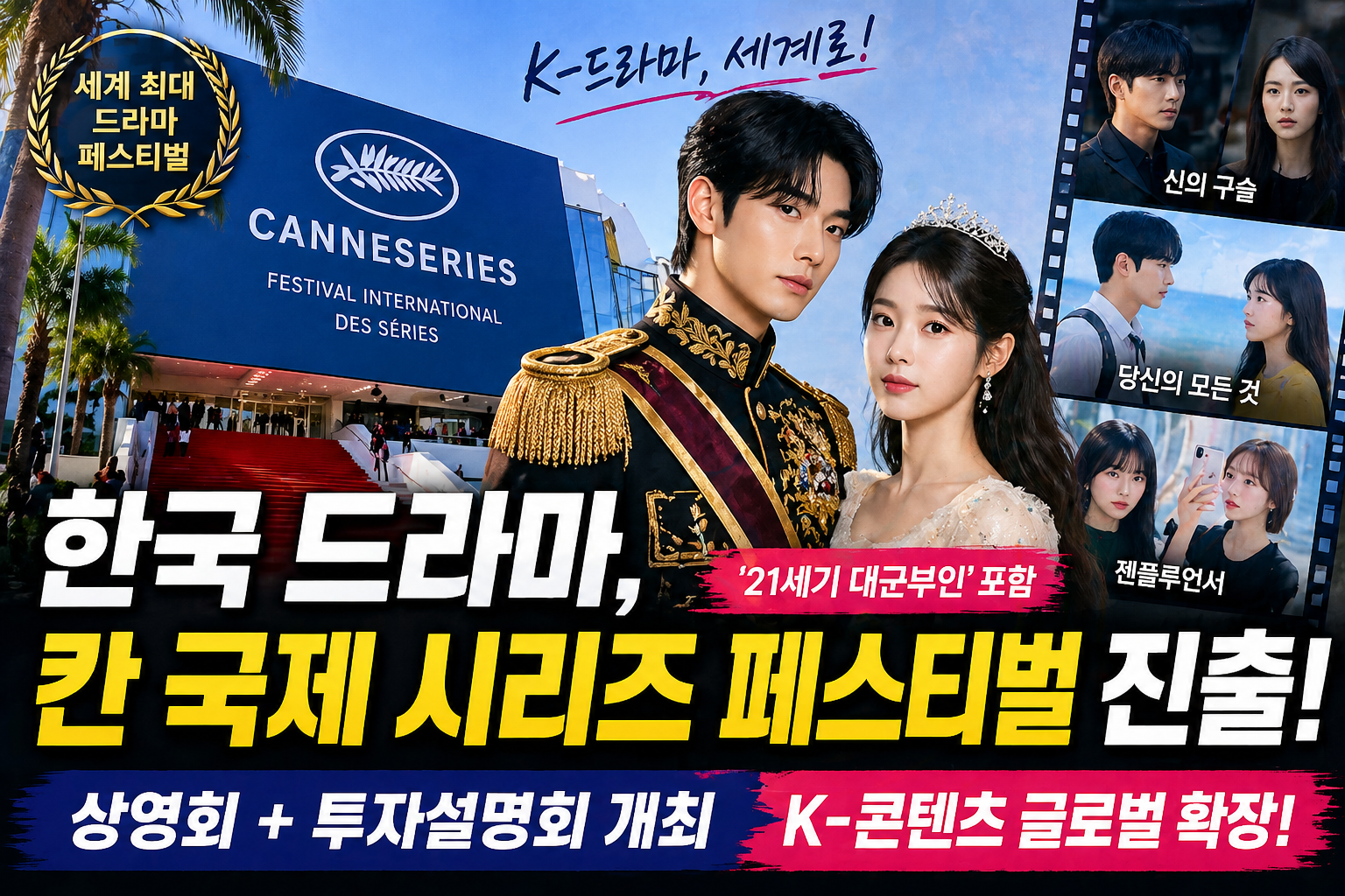 2026년 4월, 한국 드라마가 프랑스 칸에서 열리는 세계적인 콘텐츠 행사인 칸 국제 시리즈 페스티벌에 참가하며 글로벌 시장 공략에 나섰습니다. 이번 행사에는 MBC 드라마 ‘21세기 대군부인’을 포함한 다양한 한국 작품들이 참여해 상영과 투자설명회를 동시에 진행합니다. 칸 국제 시리즈 페스티벌은 전 세계 약 40여 개국이 참여하고, 최대 2만 명 이상의 방문객이 찾는 대형 행사로 드라마 분야에서는 세계 최고 수준의 행사로 평가받고 있습니다. 이곳에서는 단순히 작품을 상영하는 것에 그치지 않고, 글로벌 투자자와 방송 관계자를 대상으로 콘텐츠를 소개하고 실제 계약으로 이어지는 비즈니스가 활발하게 이루어집니다. 이번 한국 드라마의 참여는 단순한 문화 교류를 넘어 콘텐츠 수출과 산업 확장을 목표로 한다는 점에서 의미가 큽니다. 특히 최근 K-콘텐츠의 글로벌 영향력이 확대되는 상황에서, 이러한 국제 행사 참여는 한국 드라마의 경쟁력을 입증하는 중요한 기회로 작용하고 있습니다.