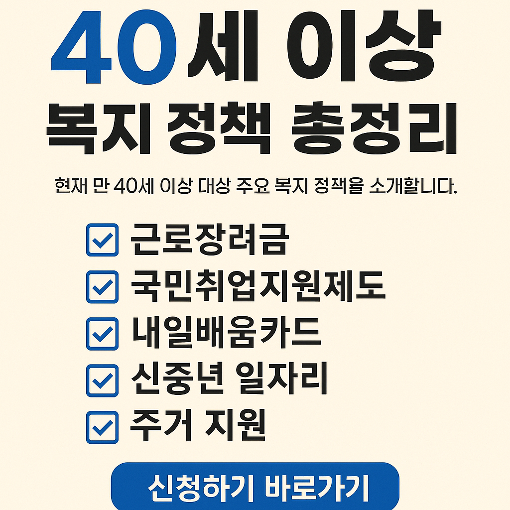 40세 이상 중장년층을 위한 2025년 정부 복지 정책을 한눈에 정리했습니다. 각 정책별로 지원 대상, 핵심 내용, 신청 방법, 그리고 바로가기 링크를 함께 제공합니다. 꼭 필요한 정보만 깔끔하게 확인해 보세요!