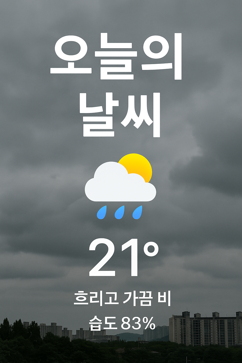 현재 기온은 약 21도, 습도가 높고 하늘은 잔뜩 흐려져 있으며, 오후와 저녁 사이에는 소나기와 비가 오는 시간대가 포함되어 외출 시 주의가 필요합니다.