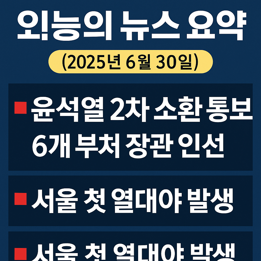 2025년 6월 30일 월요일, 오늘의 YTN 주요 뉴스에서는 윤석열 전 대통령에 대한 특검 소환, 정부 장관 인선 발표, 그리고 서울 열대야와 폭염특보 확대 등 굵직한 이슈들이 보도되었습니다.