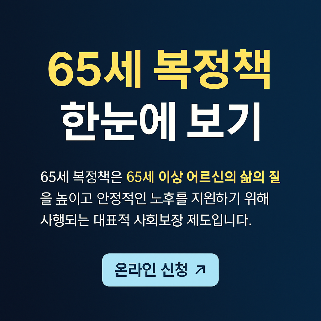 65세 복정책은 고령화 시대에 노년기의 기본적인 생활과 돌봄을 보장하는 사회안전망입니다. 특히 노인장기요양보험은 일상생활이 어려운 어르신에게 시설·재가 서비스를 제공해 가정의 돌봄 부담과 비용을 줄여줍니다.