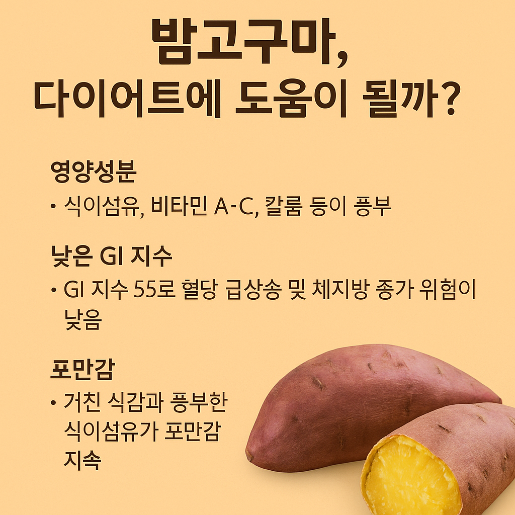 • 밤고구마: 포슬포슬하고 포만감 높으며, GI 낮아 체중 감량 중 섭취에 적합