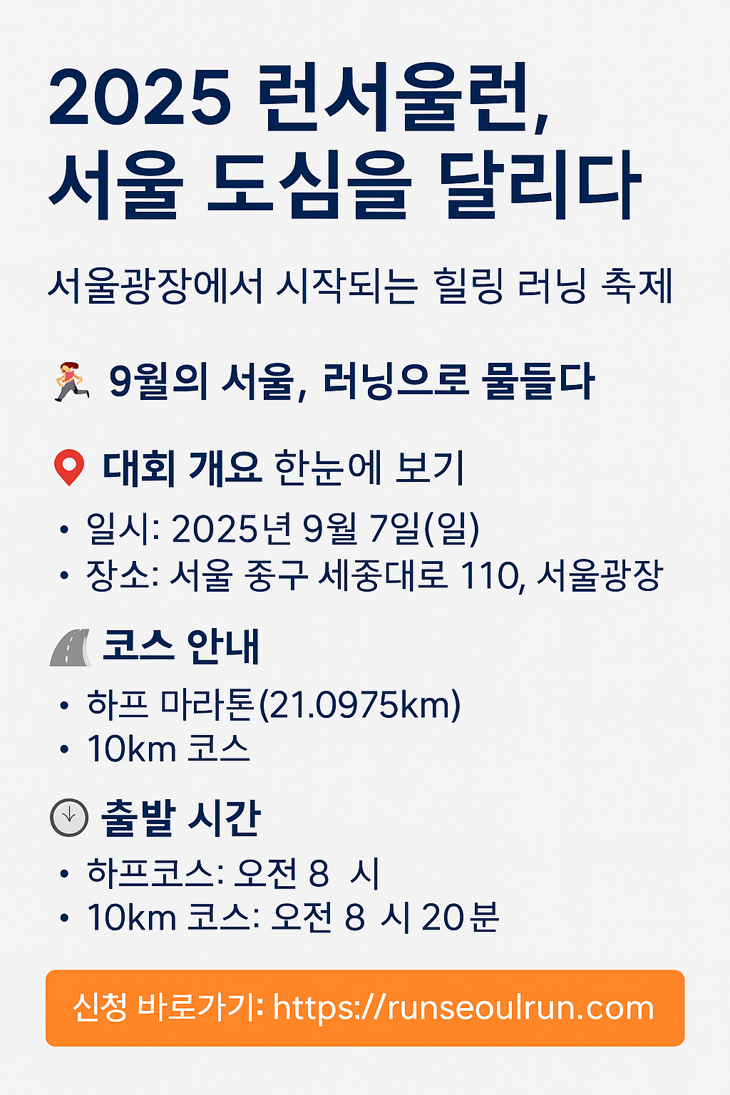 매년 가을이면 서울 도심 한복판이 달리기 열기로 가득 찹니다. 올해도 어김없이 2025 RUN SEOUL RUN(런서울런)이 9월 7일(일)에 개최되며, 수많은 러너들의 이목을 집중시키고 있습니다. 제19회를 맞는 이번 대회는 단순한 기록 경쟁이 아닌, 서울의 아름다움을 함께 달리며 체험하는 도시형 러닝 페스티벌입니다.