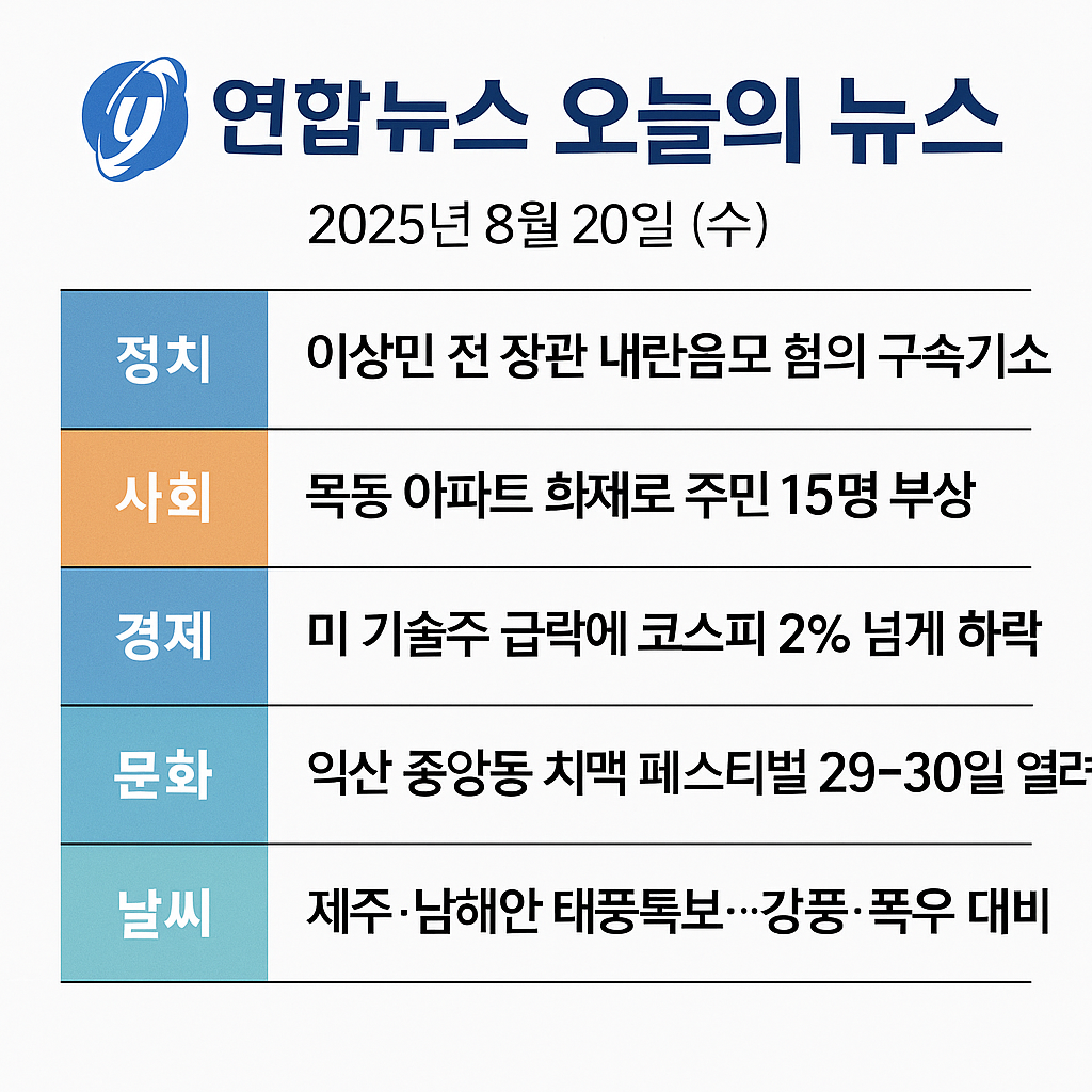 2025년 8월 20일 수요일 연합뉴스 주요 뉴스