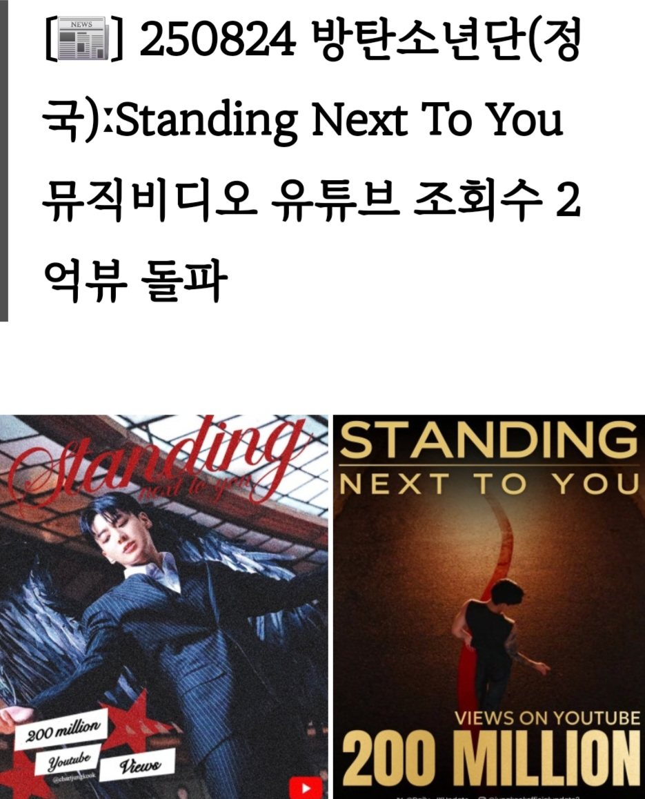 정국의 ‘Standing Next to You’ 2억뷰는 단순한 숫자가 아닙니다. 그 안에는 10년 이상 정국을 지켜온 팬들의 애정, K-팝의 세계화 흐름, 그리고 정국 자신이 음악으로 만든 진심의 시간들이 모두 담겨 있습니다.