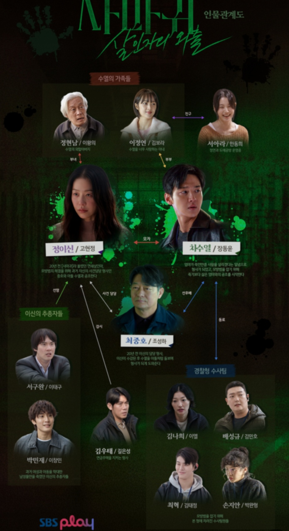 | 장동윤 | 차수열 – 강력계 형사. 살인마의 아들이라는 낙인을 안고 살아온 인물. 어머니와 공조하면서 내적 갈등과 분노가 폭발합니다. |