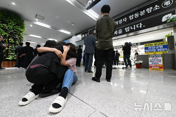 [무안=뉴시스] 이영주 기자 =  12·29 무안공항 제주항공 여객기 참사 유가족협의회의 추석 합동 차례가 열린 6일 오후 전남 무안군 무안국제공항에서 참사 유족들이 주저앉아 서로 부둥켜 안고 오열하고 있다. 2025.10.06.  leeyj2578@newsis.com