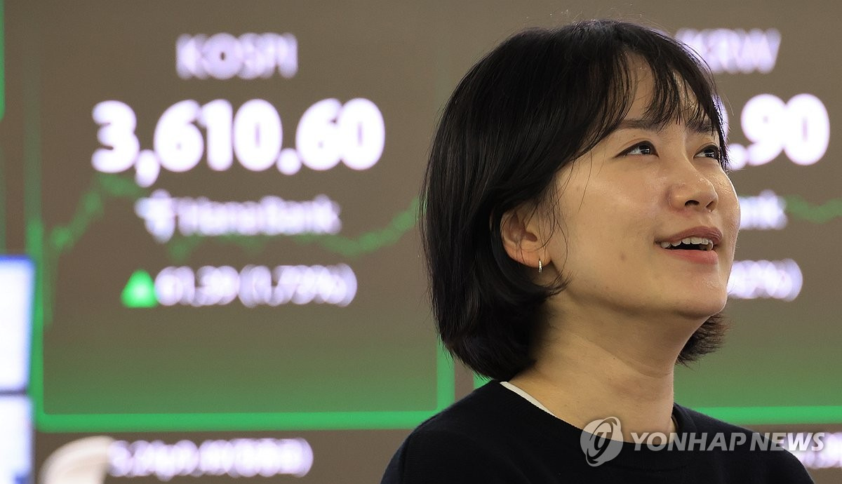 (서울=연합뉴스) 최재구 기자 = 10일 서울 중구 하나은행 본점에서 직원들이 주가 및 환율 전광판 앞에서 활짝 웃고 있다. 이날 코스피는 1.7% 넘게 올라 사상 처음으로 3,600선을 돌파했다. 전장보다 61.39포인트(1.73%) 오른 3,610.60에 장을 마쳤다. 2025.10.10 jjaeck9@yna.co.kr