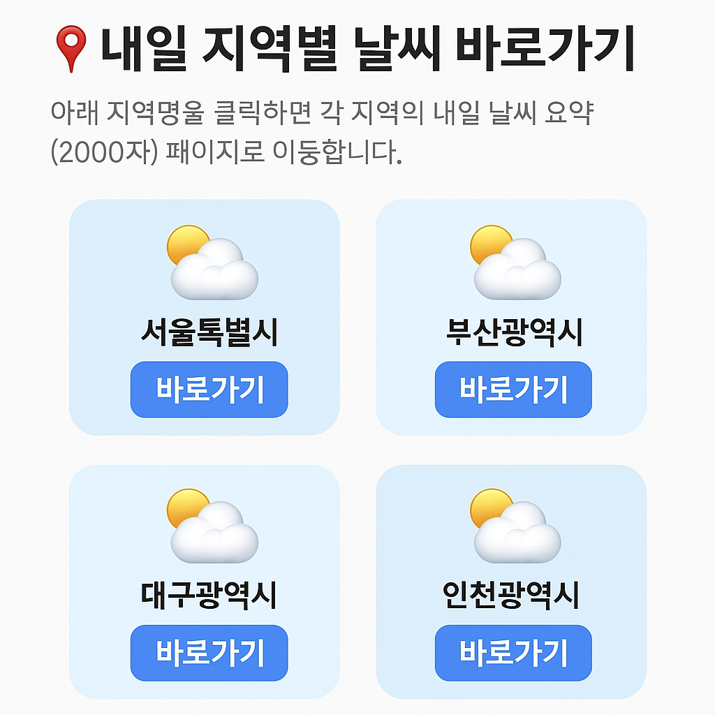 아래 지역명을 클릭하면 각 지역의 내일 날씨 요약(2000자) 페이지로 이동합니다.