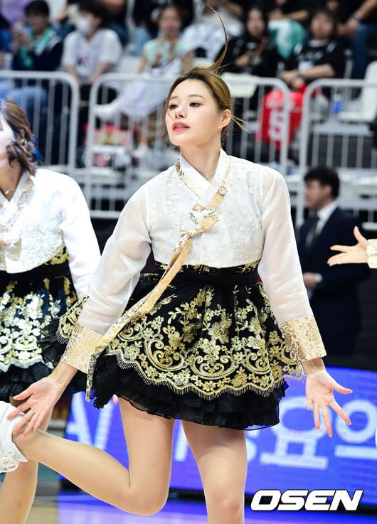 음악이 점점 고조되면서 장구와 EDM 비트가 섞이고, 치어리더들은 한복의 소매를 휘날리며 리듬에 맞춰 춤을 췄다. 한복의 주름이 움직임에 따라 자연스럽게 퍼지고, 부채를 한껏 펼칠 때마다 조명이 반사되어 장내 전체가 붉게 물들었다. 그들의 안무는 단순한 응원이 아니라 **하나의 공연예술**에 가까웠다.