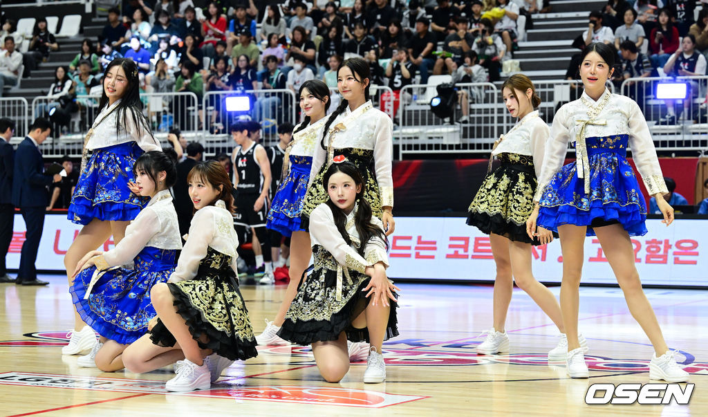 kt 치어리더가 한복을 곱게 차려입고 율동을 펼치고 있다.